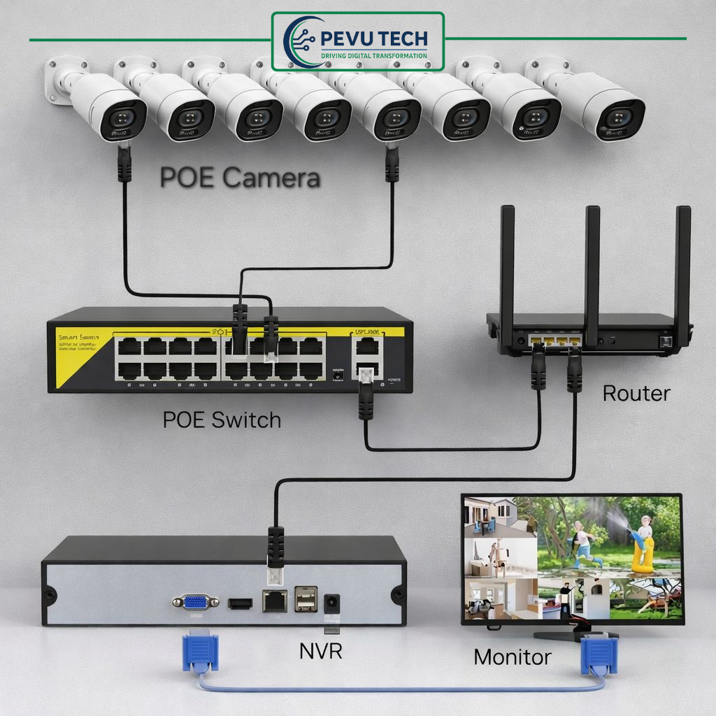A Smart CCTV connection in Kenya allows you to monitor your home, office, school, or business from anywhere using your phone or computer. PevuTech designs and installs smart CCTV systems using PoE cameras, PoE switches, NVRs, routers, monitors, and CAT6 network cables to deliver clear video, stable internet connectivity, and reliable security surveillance.